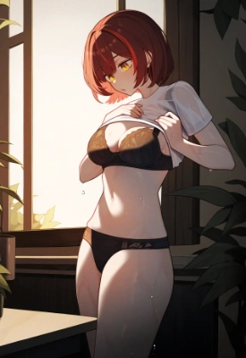 best quality ,very aesthetic ,from above, 1boy is touching Female Genital, nsfw, 1girl is [[wavy]] {{{red hair}}} and [[yellow eyes]], large breasts, 24 years old, wet, standing, {{half undress}}, breast focus, hands up, looking down,, black underwear, shirt, cleavage, best quality, amazing quality, very aesthetic, absurdres