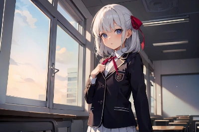 very cute female child,10 yo,white hair,bangs,medium hair,blue eyes,flat chest,