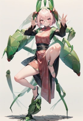 女の子二人、女の子は子供服を着て寝そべっている、女の子の髪の毛と目の色はピンク色で赤縁の眼鏡をかけている、お互いを見て笑っている、幼稚園の遊戯室の中、沢山の花びらと葉っぱの入った箱が女の子の横に二つ置いてある、女の子達は花びらと葉っぱをタイルの代わりに使ったモザイクアートを作っている、モザイクアートは猫が顔を撫でている場面の絵、細密なアニメのデジタルアート