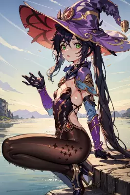 best quality,ultra-detailed, extremely detailed CG,beautiful , , (genshin),(mona:1.2),(genshin impact1.5),black hair,green eyes, long hair,light twin tails,black tights,small breasts,short girl,blue clothes, blue arm support ,witch hat,straight bangs,photorealistic, by famous artist, world masterpiece, full_body, view straight on,wet, flat chest, girl,woman,female, young,19 yearsold,sidelocks, Authentic and detailed face, small_breasts, bright skin, Gemological ornaments,choker, black_gloves ,capelet,high_heels, collarbones,outdoors, landscape, an epic scene, Absurd,dynamic background,detailed background, from behind, all fours,amazing quality