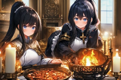 masterpiece, best quality, extremely detailed,ultra-detailed,4K, anime, fireplace, fantasy, different world,room, two people,priest and paladin,