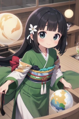 (((very longest hair))),black hair, smile,straight Hair,hair ribbon,mintgreen stripe,Black Eyes,flat chest,straight Across bangs,princess Cut, Very Long Sideburn,roundry Head,Droping eyes,cute,Meekness,Bob Cut,long back hair,12 years Old,Kimono, hibernation,fetal position,