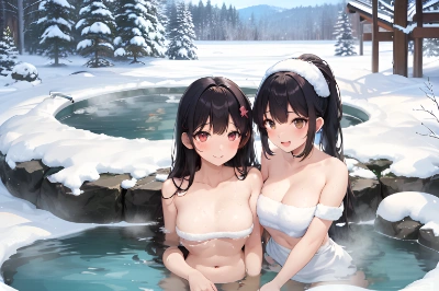 high quality, 2girls, (kawaii), high quality face, wide bath towel on breast, flirting, enter the hot spring, soak in hot springs up to your shoulders, pretty, smile, black hair, long hair, winter landscape, snow is piling up, it's snowing, excursing, kissing, kissing nipple,