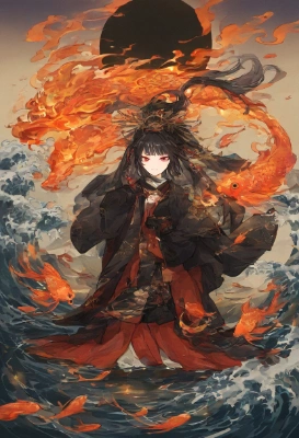 1girl,japanese girl,cool face,red eyes,red eyeshadow,long eyelashes,black hair,long hair, ponytail,flower hair ornament,fire bird,standing,dark sun,sumi-e,japanese painting,masterpiece,very aesthetic,extremely detailed,high resolution,perfect anatomy,, best quality, amazing quality, very aesthetic, absurdres