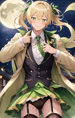 masterpiece, best quality, extremely detailed, anime, girl, skirt, a cool boy, good-looking guy, handsome man, ponytail, ahoge, garter belt, maid uniform, blue hair, odd eyes, maid, ikemen, fantasy, night view, standing,arms behind back,, blushing, smiling, happy,