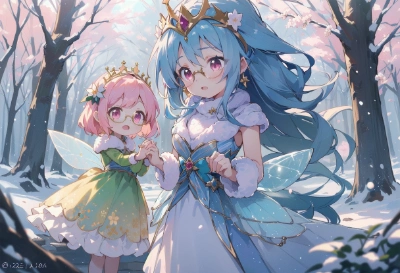 (右の娘)「冬が終わり、これからは春です、時の砂時計を引き継ぎます」って感じでしょうか(^^;; 右が冬、左が春の妖精さんのつもりです。 節分は冬から春の変わり目ってことで、季節のバトンタッチのイメージですね(^^; バトンをどうしようかと思ったんですが、時の流れを司るものかな〜と思い、また機械時計は何か違うなと思ったので、砂時計にしました(^^;; 1枚目はちょっと真面目な感じで、最初に作ったもの、2,3枚目は明るい雰囲気に変えてます(^_^;) プロンプトは1枚目のものを載せておきますが、蝋梅は認識できないみたいですね…^^;