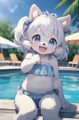 (furry), (hairy), masterpiece, best quality, extremely detailed, kindergartener girl, baby, bangs, thick tail, (1 tail), in stadium, cute, jumping, athletic shoes, cheerleader, (cheerleader outfit), rah-rah skirt, pom-pom, cheer up, (panties), pantyshot,,