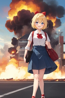 1girl, looking at viewer, blonde hair, short hair,(hair bow:1.4),red bow, blue eyes, red ribbon in hair, wearing white summer dress with lace and frills, bare shoulders, holding hands behind back, standing outside on green grass, smiling happily, behind her clear blue sky with fluffy white clouds, sun rays shining down, cicadas singing (cicadas:1.2), next to her outdoor water tank made of wood, inside many ramune bottles floating in cold water, condensation dripping down bottles, slices of lemon and mint leaves inside bottles, light refracting through glass bottles, fizzy bubbles rising in ramune, plants and flowers around tank (sunflowers, cosmos, hydrangea), summer wind blowing hair and dress gently (wind:0.8), warm sunny day, soft shadows on ground
