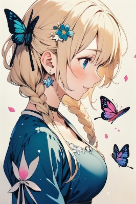 artisan contour, sophisticated contour, sexy skin, coquettish skin, (soft smile: 0.7), sophisticated eyes, 1 girl, earrings, jewelry, short hair, ribbon, traditional media, blue eyes, blonde hair , hair ribbon, hair ornament, flower in the hair, bangs, collarbone, profile, blue dress, petals, leaves, pink flower, butterfly, flower, insect, simple background, white background, upper body, watercolor (middle), mouth closed, painting (During),(ramune:1.4), object to cheek, holding, holding bottle, bottle,,,