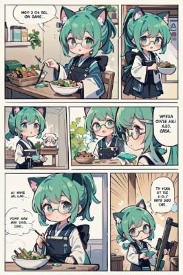 ((masterpiece, best quality, extremely detailed, absurdres)) ((a manga of white-line-4-panel:1.4)) ,Manga style, speech bubbles, panel layout, concentrated lines, Breakyoung-man muscular flat-chest ((black-short-wavy-hair:1.4)) round-glasses kimono pants monk samurai bagcyber-punk-style city rain night town street food-stall food-cart table full-moon perfect-anatomy perfect-hands ,