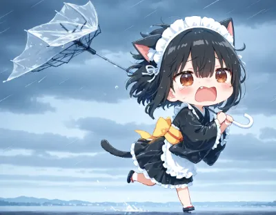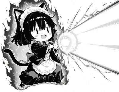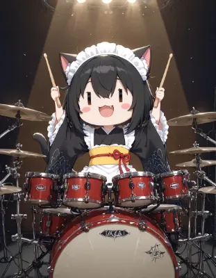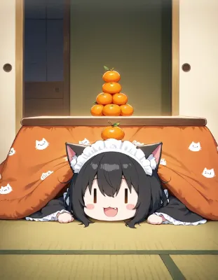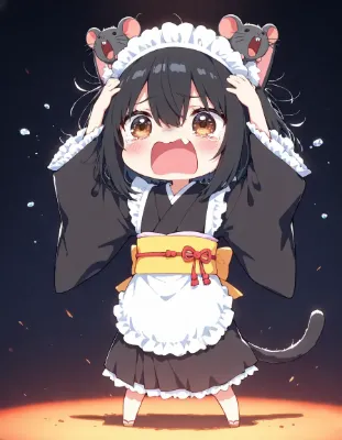 (3girl), (((black hair,black cat ears,black cat girl,black cat tail,cat ears))),(shaggy cut hair),(disheveled hair),hairs between eyes, medium hair, ((beautiful eyes)),(brown eyes),((black kimono maid)), (yellow obi),(white Frill,maid headdress,wide sleeves, long sleeves,frilled sleeves), cute face,((smile,open mouth)), ((loli:1)),