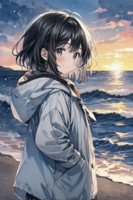masterpiece, best quality, extremely detailed, anime, girl, 18yo, tiny, smiling sadly, bobcut, black hair, black eyes, student, colorful, watercolor, sunset, winter, snowfield, down jacket, hands in pocket, back view, looking at viewer , colorful, watercolor, <lora:flat2:-1> <lora:saturation:-0.55> ,