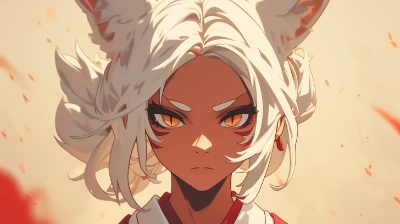 2d animation, cinematic view, stop motion, killer queen, beautiful cute dark-skinned girl, japanese miko clothes, silk texture, white hair, fox ears, thick eyebrows, --ar 47:20 --niji 6