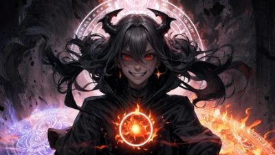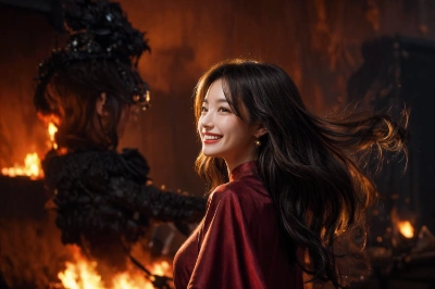 BREAK (grin and laugh:1.1), evil grin, fearless smile, evil looking face, upward glance,