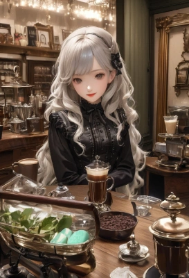 Haagen-Dazs chocolate mint, gothic lolita fashion, antique coffee shop,Representation Style real Realistic Representation Exposure Clear Delicate Fine clear,silver blonde long wavy hair, small smile,<lora:noline:0.5> <lora:yawanuri:0.4> ,