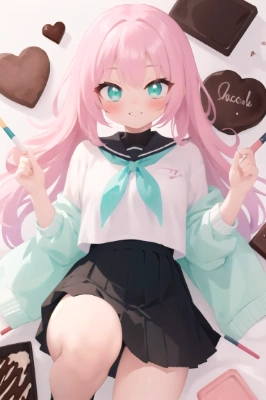 チョコミントカラーをパステルカラーで出してほしかった(過去形) もはやミント感不明。 綺麗なパステルカラー出してくれるかってかなりモデルに左右されるような……? 試行錯誤後だったんですが、AIピクターズ上で使えるモデル増えてたのですね。 個人的には、nextgenmix_r5Bakedvaeで水彩、主線なしLoRA使ったのが一番好みのパステルカラー出してくれました。 ただ、雰囲気はとても好きなんですが、チョコが飛び散ってるわでろでろに溶けてるわそれを素手でつかんでるわで汚い印象の絵が多く生成され……。なかなかいい絵が出てこず。 最終的には、よさげな2枚(2枚目と3枚目)を自分で画像編集して合体させました。 ↓もうちょっと細かい話ぐだぐだ nextgenmix_r5Bakedvae・水彩・主線なしLoRAでいこうと思った時に出てきた子が総じてピンク髪でかわいかったので、ピンク髪にしました。日を改めたら全然ピンク髪にならなくてピンク髪は指定しました。 何枚か生成したところ、2枚目が出ました。 髪のグラデーション、“パステルカラー”というテーマにぴったり(と感じた)背景がひどく気に入りましたが、描きかけエプロンのような変な布、溶けているチョコをつまむようにつかんではにかんでいるという、絵としての全体的な完成度が低いものでした。 調和の取れた似たような絵を出してもらおうとするものの、髪色が背景と溶け合うような自然なグラデーションや、優しい色の絵の具をこぼしたような背景はそう出してくれず……。inpaintも使ってみましたが(使いこなせず)全然だめ。 i2iをすればいいのでしょうが無料会員でごめんなさい……。一応TrinArtでやったんですが、nextgenmix_r5Bakedvaeのクセが完全に消えて『ああ、とりんさま(orでりだ)の描いた絵だ』ってなっちゃうんですよね……。それだけならともかく、余計破綻して全然いい雰囲気にならない。 再利用して出したものの中、プロンプトからピンク髪消しちゃってて違う髪色の子出ちゃったんですが(3枚目)、手もチョコも綺麗なんですよね。でもやっぱり(2枚目の)ピンクグラデ髪の子が忘れられなくて、『そうだ合体させよう』と思いました。幸いにも構図や着ている服はほぼ同じですからね。2枚目の子の顔のサイズを3枚目の子に合わせて、首から下の体は削除。唯一リボンはあった方がかわいいなと思ったので、そこは残しています。背景は消しゴムで消しつつ、3枚目のものと馴染ませました。複雑な背景や髪型じゃなかったので誤魔化しが利いてよかったです。とはいえ、背景のファンシーな色合いも2枚目の方が好きなんですけどね(わがまま) おさげもなんとか消しました。 サイズは同サイズでもよかったんですが、3枚目の子はよくよく見ると土気色気味で、足は特に顕著だったのでトリミングしました。せっかくトリミングするなら目立つ部分だけでいいかと、腰から上くらいまでにしています。 言われると違和感があるかもしれませんが、それでもだいぶ自然に合体できたんじゃないでしょうか。いや、できたはず。 色味の調整も最初はしたものの、そのままの方がいいかなと思いそのままです。 とりあえず、気に入った2枚目の子が無駄にならなくてほっとしました……。 ピンク髪にラムネ色のグラデーションって綺麗ですね。ピンクと濃いめの茶色の相性もいいですね、美味しそうです。 生成情報は2枚で異なっているためこちらでは非公開にしてますが、3枚目は再利用しており、そちらでプロンプトを公開しています。 https://www.aipictors.com/works/273391/ (使用LoRAは異なっています) ↑の方がパステルカラーな服着てて良さげなのは……うん……。