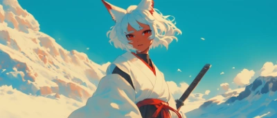 2d animation, cinematic view, magic hour, dramatic, killer queen, beautiful cute dark-skinned girl, japanese miko clothes, silk texture, white hair, fox ears, thick eyebrows, --ar 47:20 --niji 6