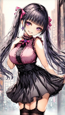 (jirai kei:1.2), jewelry, earrings, black footwear, pink shirt, frills, black skirt, miniskirt, black thighhighs, zettai ryouiki, garter straps, sleeveless,