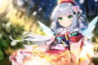 masterpiece, best quality, look up at the stars,masterpiece,soft touch picture,ultra Details intricate cherry blossom,ultra Details,ultra intricate,ultra rich detailed ink+anime color+water color,Ultra detailed precision complicated dynamic,holly snow,holly starry sky at dawn light effect,ultra detailed panorama torii+shrine,movie fresh luster+glare+strobe+bounce+flare top light sfx effect, out of focus,smiling face, + +Young+loli girl,(ultra Details etailed intricate very ( cute) friendly (kawaii) face (kawaii) friendly (cute)),vivid silver+white+ fluttering+medium wave hair,cute colorful hat,vivid emerald emerald eyes,ultra Details light novel,Ultra detailed complex colorful Magical Kimono+Japanese clothes+suit clothes embroidery+ruffled skirt,ultra details elegant complexity intricate colorful coat,tights,gust of wind,Ultra details2arm,2hand, 5finger,extremely detailed CG