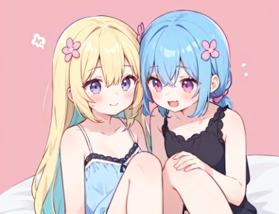 (2girls, yuri, lesbian couple), (teenager, jk, medium bust:1.2), slender, (mesugaki, triumphant face:1.2), (fang:0.6), young cheeky girl, highlights in eyes, confident smile,