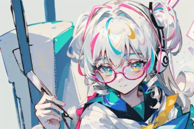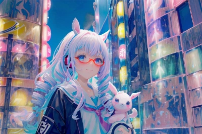 (colorful, pastel color, white background:2), (masterpiece, best quality, extremely detailed, anime), (holding and watching smartphone:1.5), (lots of white rabbit among model:1.6), walking, (solo girl),teenage girl, (white hair, drill hair, long hair:1.6), original character, smile+happy, (pink thick frame glasses,headphone:1.5), (white colored sailor suit:1.4), full body, side view, side facing, <lora:flatBG:1> <lora:boldline:0.95>,