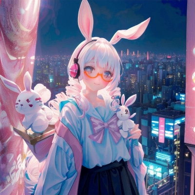 masterpiece, best quality, extremely detailed, anime , (solo),teenage girl, original character, colorful, cyberpunk, (tokyo city night view:1.8), , (white hair, drill hair, long hair:1.3), smile+happy, rabbit ear, (pink thick frame glasses,headphone), sailor suit,Lolita fashion, upper body, (white rabbit toys:1.2), , , <lora:hairdetailer:0.4> <lora:Anime_Figure:0.7> ,