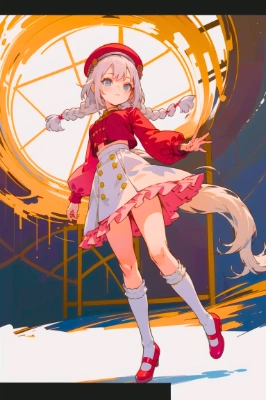hat, braid, mary janes, beret, red footwear, long sleeves, red headwear, white socks, skirt, kneehighs, shoes, frills, red jacket,