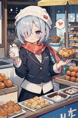 A masterpiece, chibi kawaii mushroom witch girl silver-short-bob-hair red-eyes mushroom-witch-hat gray-duffle-coat smiling food-cart food-stall table (beef-sushi-on-wood-lunch-box) sausage pork chiken steam-punk-style town street (colorful-mushroom:1.2) ((perfect-hands perfect-anatomy :1.4)),