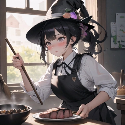 あかねさんのお肉パーティー① (全6話) ただいまー。 あれ、今日は返事がない。 キッチンの方で人の気配はするのに。 茜さん? 「お鍋さん、急いで。 あの人が帰ってきちゃう」 ヘラやボウルがキッチンを飛び回り、 鍋が踊るように何かをぐつぐつ煮てる。 まるで楽団を指揮するみたいに、 魔法の杖をふるう茜さんがいた。 「炎の精霊さん。お肉は適度な焼き加減で」 茜さん、 また魔法で手抜きしてる。 言い忘れてたけど。 うちの奥さん、魔女だってことは内緒にしてて、 僕も知らないことになってる。 魔女の帽子とか。 知らないフリをする僕の身にもなって欲しい。