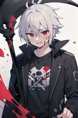 masterpiece, best quality, extremely detailed, anime, a cool boy, good-looking guy, handsome man, ponytail, shorthair, silver hair, white hair, red eyes,beast eyes,glare, very short hair,fearless smile,black suit,kneeling,red crystal,black gloves,looking sideways,Grim Reaper,