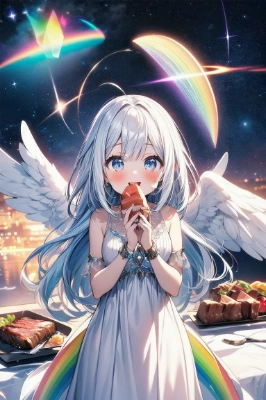 original, one pretty girl, angel, goddess, mysterious, divine, Transparent, pale richly colored hair, prism color eyes, white skin, Are fat, eating a lot of steak, Are thin, angel ring, crystal wings, long dress,laughing out loud, colorful, universe, heaven, milky way, prism stars<lora:flat2:-0.2> <lora:hairdetailer:0.3>,