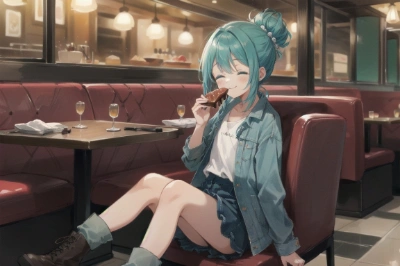 masterpiece, best quality, highres, 1otoko no ko, solo, sweater with vertical large stripe, Denim skirt, knit hat, かわいい, flat chest, aqua hair, aqua eyes, half updo, smile, arms behind back, Leaning side to side, street<lora:flat2:0> <lora:hairdetailer:0.5>,