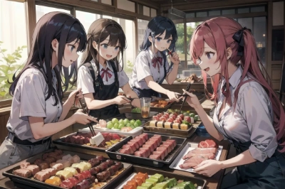(best quarity:1.2),masterpiece,japanese style,1boy,buddhist priest,adult,(skin head:1.2),closed eyes,clenched_teeth,endured_face,restrained,lotus_position,(In front of him are plates of meat dishes such as steaks, hamburgers, roast chicken, and pork cutlets),main hall of a temple,