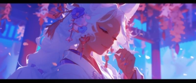 2d animation, cinematic view, magic hour, dramatic scene, killer queen, beautiful cute dark-skinned girl, japanese miko clothes, silk texture, white hair, fox ears, thick eyebrows, --ar 47:20 --niji 6