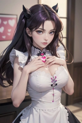 masterpiece, best quality, extremely detailed, anime, Heart, girl, longhair, purple hair, maid uniform, fantasy, maid(Fate Grand Order, Sakura Tohsaka making a heart mark while using her arms on her chest is very cute) (FGO, Sakura Tohsaka) (Sakura Tohsaka is cool),