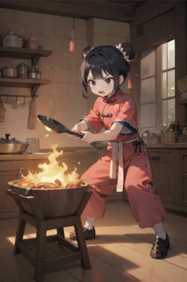 masterpiece, best quality, extremely detailed, anime, a girl, child, lolita, black hair, short hair, 2bun hair, black eyes, narrow eyes, sulking, barking, kung fu, (completely pink kung fu clothes), completely pink kung fu pants, black loafers shoes, cooking, kung fu pose, holding a chinese style frying pan, (shaking a chinese style frying pan), ancient chinese style stove with fire, ancient chinese style room, ancient chinese style kitchen, earthen wall, middle ages, age of discovery,