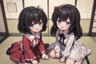 (8K, best quality, master piece: 1.2), super high resolution,2girls, super detailed face, detailed eyes,(playing with cat-shaped origami),BREAK, (wariza),one girl is wearing a white dress with a floral pattern, one girl is wearing a white blouse and red dresssmile,tatami room <lora:hairdetailer:1> <lora:eyecolle_lemon_v100:1> ,