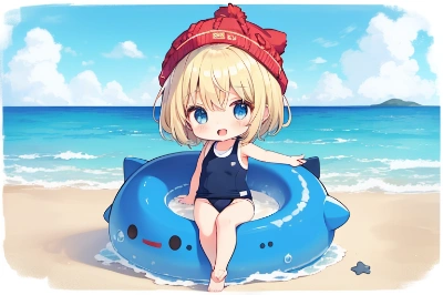 1girl, blonde hair, blue eyes, short hair, red ribbon in hair,(hair bow:1.2),red bow,chibi, standing, facing front, looking at viewer,( holding big red heart:1.4), smiling happily, blushing lightly, indoor scene, genkan entrance, taking off shoes, wooden floor, sunshine coming through door, wearing school uniform, blue skirt, white shirt, red ribbon on chest, bare legs, white socks, shoes on floor, hair over one eye, wind blowing hair, detailed eyes, long eyelashes, rosy cheeks, soft smile, canting head, delicate hands holding heart, fingernails painted pink, intricate background, highly detailed