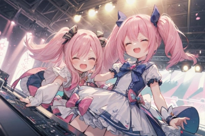 (((magical girl costume))),(((Live venue))),(chibi:1),masterpiece, best quality, extremely detailed, anime, Idol,(((2 girls))), laugh,open mouth,close eyes,(twintail,pink hair),dancing,dutch angle,looking at viewer,from below,<lora:flatBG:-0.7> <lora:hairdetailer:1>,