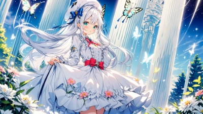 (ultra miracle detail master piece:1.2),(ultra miracle detail Photoshop quality:1.2),(gradation icy color cool color:1.2),(ultra miracle detail beyond imagination light novel illustration:1.2),(ultra miracle detail beyond imagination screen tone:1.2),(water color hdr wdr iso cgi effect:1.2),(rough sketch:1.2),(ultra miracle detail innocence lolita pretty cute (kawaii:1.4) cute pretty lolita innocence:1.3),(Fluffy medium long silver hair:1.2),(vivid gradation emerald eyes),(natural make face:1.2),(elf ears:0.7),(elaborate design beret ribbon hat),(ultra miracle detail elaborate design white long sleeve blazer school costume),(elaborate design skirt),(red tie),(ultra miracle detail extremely Exquisite A dreamlike ultra rich real background:1.2),(The most beautiful December constellations you can see in the park background:1.2),(ultra miracle detail innocence kawaii:1.2),(medium breasts),(gorgeous),(scattert:1.2),(garden),(blessing dramatic:1.2),(shining girl),(calmness),(gardening:1.2),(butterfly),<lora:add_detail:0.7> <lora:sharpen-soften:0.15>