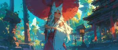 2d animation, cinematic view, magic hour, on the bridge, killer queen, beautiful cute dark-skinned girl, japanese miko clothes, silk texture, white hair, fox ears, thick eyebrows, --ar 47:20 --niji 6