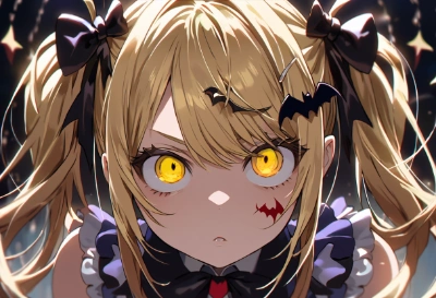 A kawaii lustful vampire girl with two side up hairstyle and swept bangs and yellow eyes and huge breasts and baby face and droppy eyes and wet is bouncing breasts and squating. kind smile, looking down at viewer, (hands are rabbit pose:0.9), (blonde hair:0.8), (streaked hair, inner color hair1.2), (cleavage cut, sideboob, bat hair ornaments, hairclip, revealed outfits, leather bat bow tie, lace up corset belt, fishnet thighhighs, ruffle micro mini skirt, off shoulder, detachable sleeves, bell sleeves, navel, under navel heart tattoo, micro thong, strap heels), (energetic compositions, abstract rays, abstract glitters:0.8), (on the stage:0.9), full figure, close to viewer, from front, from below, (brushwork of Alfons Mucha, Art nouveau:1.1), (illustration, dramatic lighting:1.1), Masterpiece, top quality, very detailed, <lora:flat2:-0.95> <lora:boldline:-1> ,,