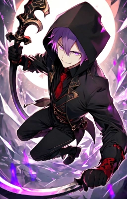 masterpiece, best quality, extremely detailed, anime, a cool boy, good-looking guy, handsome man, ponytail, shorthair, silver hair, white hair, red eyes,beast eyes,glare, very short hair,fearless smile,black suit,red crystal,black gloves,looking sideways,Grim Reaper,hold a weapon,looking down from above,red crystal,red light,Backlit,Grim Reaper's Scythe,flame,Darkness,