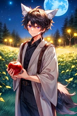 masterpiece, best quality, high quality, very delicate and beautiful, female 18 years old, solo, (((long black hair, two side up to waist))), fringes down to eyebrows, eyes sharp and strong, glossy, eyebrows glossy, eye colour magenta, 6.5 head tall, (((red hood Fashion, lace, frills, knee socks))), smiling, standing, (((holding apple))), (((background lots of apple trees, apple forest)))<lora:flat2:-0.3> <lora:hairdetailer:0.8> ,