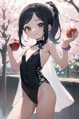 {{{{{8 years old female,young, primary school student,baby face,good girl,young,cute, kawaii,loli,pretty,little female child,kid,very small breasts,flat chest}}}}},{{{eyelashes, jewelry eyes, cute eyes,long eyelashes,brown eyes,eyes visible through hair}}},{{{ black hair, low ponytail,swept bangs, scrunchie}}} <lora:flat2:0.5> <lora:boldline:-0.5> ,smile, ((Dancer’s Costume)),in heat, smile,model posing, thighs, cowboy shot, smile, spring, ((apple)),