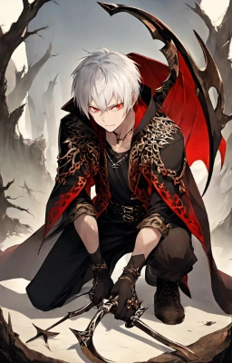 masterpiece, best quality, extremely detailed, anime, a cool boy, good-looking guy, handsome man, ponytail, shorthair, silver hair, white hair, red eyes,beast eyes,glare, very short hair,fearless smile,black suit,kneeling,red crystal,black gloves,looking sideways,Grim Reaper, asymmetric hair,fang,rain, black and red light,