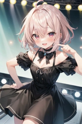 masterpiece, best quality, extremely detailed, anime, 1girl, solo, 18yo, large breasts, sweat, (singing:1.2),BREAK,idol, white crop top, red frilled skirt, white thighhighs, red shooes,BREAK,beautiful detailed face and eyes, smile, wine red hair, long hair, hair between eyes, purple eyes, red flower hair ornaments,BREAK,stage, microphone, diffraction spikes, spotlight,