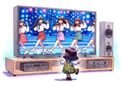 A dynamic angle close-up illustration focuses intensely on the back view of three idol girls, depicted significantly larger as they jump high in dynamic poses as if running in the air, with a clear depiction of the stage beneath them, holding hands with their legs bent, and swinging their interconnected hands high in the air, capturing the essence of an idol live concert\'s finale. Each of them has a distinctive hairstyle. The surroundings are enveloped by a multitude of colorful penlights from the audience seats, sparkling like a starry sky, creating a fittingly fantastical lighting and production for the finale. Gentle particles of light envelop the venue, adding to the magical and artistic atmosphere. The illustration emphasizes the sense of motion with rough lines and vibrant colors, presented in a horizontal format, reminiscent of a detailed anime style and an Impressionist oil painting.