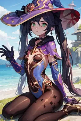 best quality,ultra-detailed, extremely detailed CG,beautiful , , (genshin),(mona:1.2),(genshin impact1.5),black hair,green eyes, long hair,light twin tails,black tights,small breasts,short girl,blue clothes, blue arm support ,witch hat,straight bangs,photorealistic, by famous artist, world masterpiece, full_body, view straight on,wet, flat chest, girl,woman,female, young,19 yearsold,sidelocks, Authentic and detailed face, small_breasts, bright skin, Gemological ornaments,choker, capelet, black_gloves, high_heels, collarbones,outdoors, landscape, an epic scene, Absurd,dynamic background,detailed background, from behind, all fours,amazing quality