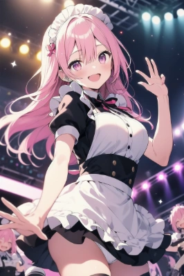 masterpiece, best quality, extremely detailed, anime, girl, miniskirt, Idol, girl, bobcut, pinafore dress, short sleeve, black hair, black eyes, wink, student, idol, fantasy, colorful, magic, classroom, school, clear sky, panty shot, smile, singing, dancing, concert, laughing, winking, smiling, happy, greatbust,